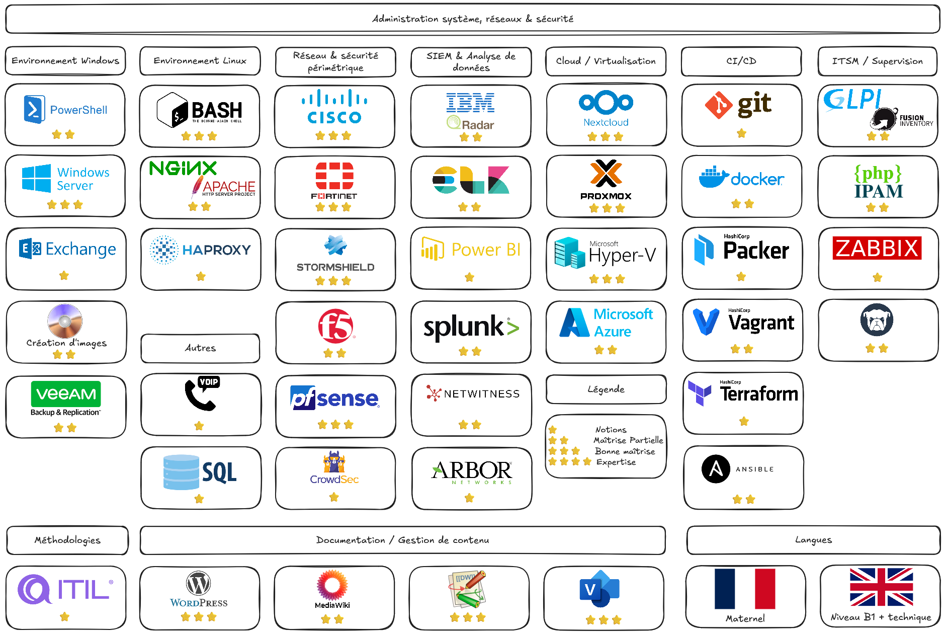 Grâce à mes différentes expériences, j’ai pu développer de nombreuses compétences dans le domaine de l’administration système & réseaux, de la sécurité et de la gestion des systèmes d’Information.